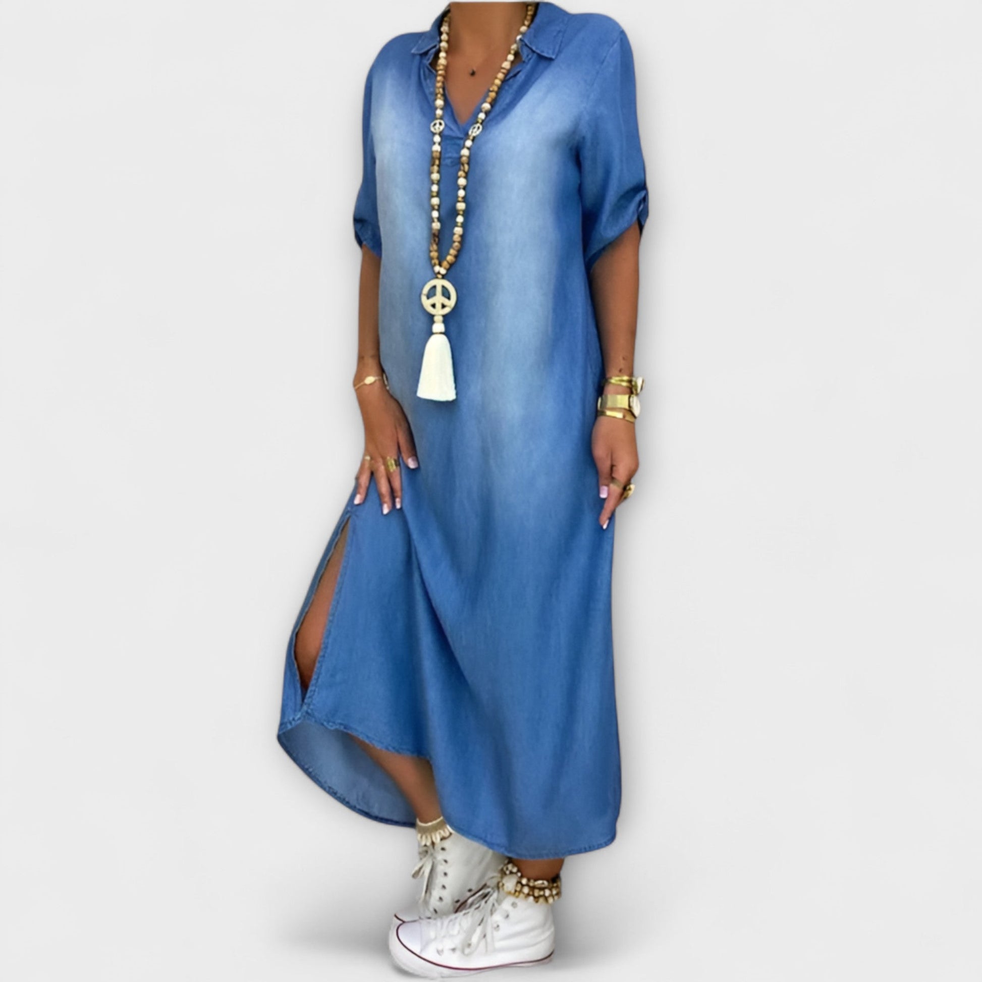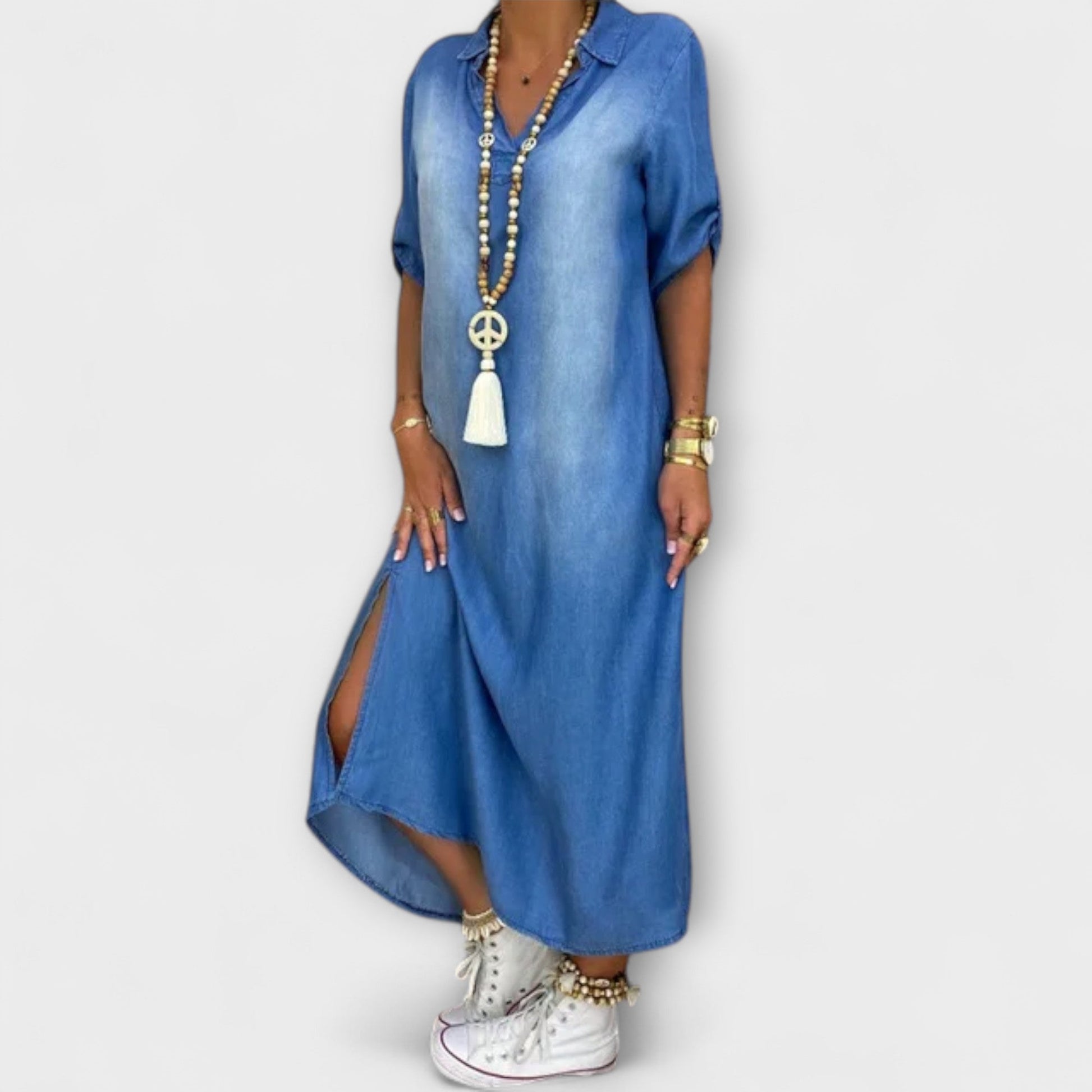 Lea - Long Denim-Look Dress with Side Slit
